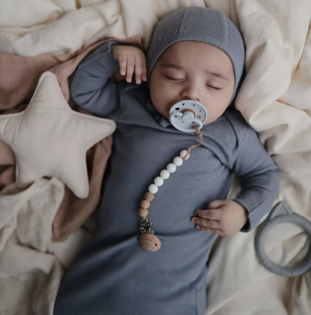 de speenclip is gemaakt van 100% voedselveilig silicone en heeft een siliconen sluiting die een traditionele favoriet op een moderne manier benadert, met kralen in houtprint.