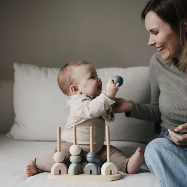 De stapelaar is gemaakt van FSC-gecertificeerd hout en afgewerkt met niet-giftige verf, voor een veilige en milieuvriendelijke speelervaring.