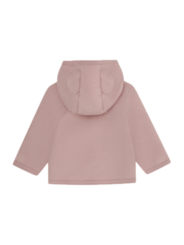 Het jasje heeft een vaste capuchon met oortjes en lange mouwen. Het heeft geribbelde randen bij alle openingen.