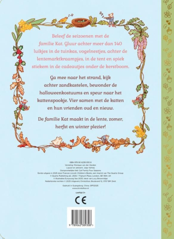 OverzichtBeleef de seizoenen met de familie Kat. Gluur achter meer dan 140 luikjes in de tuinkas, vogelnestjes, achter de lentemarktkraampjes, in de tent en spiek stiekem in de cadeautjes onder de kerstboom. Ga mee naar het strand, kijk achter zandkastelen, bewonder de halloweenkostuums en speur naar het kattenspookje. Vier samen met de katten en hun vrienden oud en nieuw.