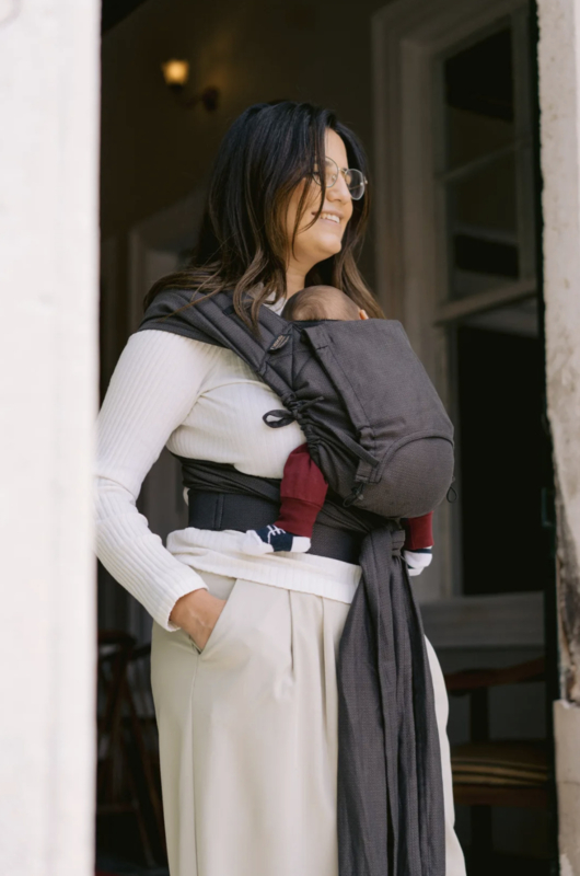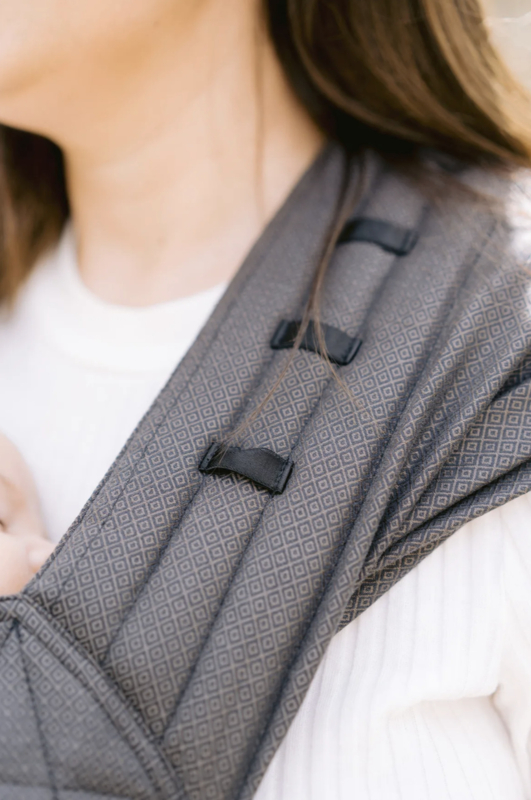 Het volledig verstelbare rugpand groeit met je baby mee en ondersteunt de natuurlijke ontwikkeling van de heupen in zowel voor-, heup- als ruggedragen posities, met spreidbare schouderbanden van draagdoekstof.